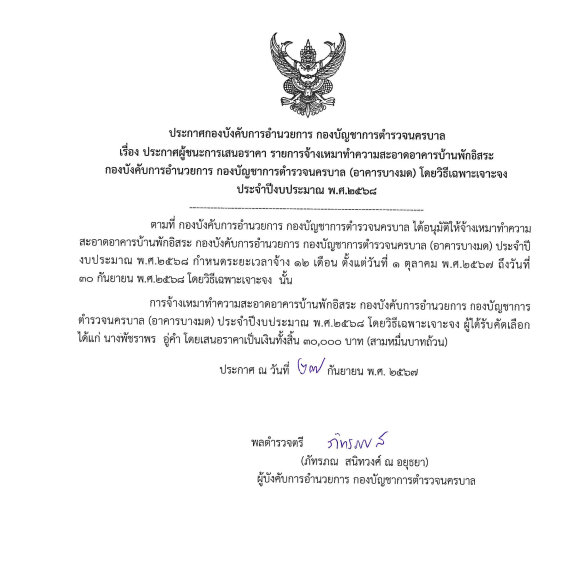 ประกาศ บก.อก.บช.น. ลง 24 ต.ค.68 เรื่อง ประกาศผู้ชนะการเสนอราคา สำหรับงานจ้างปรับปรุงห้องอเนกประสงค์ บช.น. จำนวน 1 งาน โดยวิธีการประกวดราคาอิเล็กทรอนิกส์