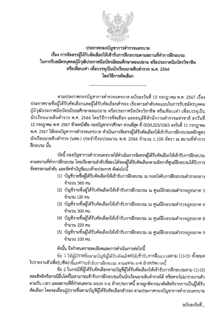 ประกาศกองบัญชาการตำรวจนครบาล เรื่อง การจัดสรรผู้ได้รับคัดเลือกให้เข้ารับการฝึกอบรมตามสถานที่ทำการฝึกอบรม ในการรับสมัครบุคคลผู้มีวุฒิประกาศนียบัตรมัธยมศึกษาตอนปลาย หรือประกาศนียบัตรวิชาชีพ หรือเทียบเท่า เพื่อบรรจุเป็นนักเรียนนายสิบตำรวจ พ.ศ. 2566 โดยวิธีการคัดเลือก