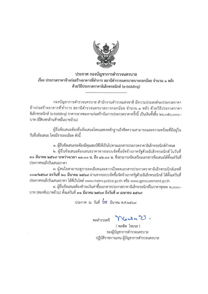 ประกาศกองบัญชาการตำรวจนครบาล เรื่อง ประกวดราคาอิเล็กทรอนิกส์ก่อสร้างอาคารที่ทำการ สน.บางกอกน้อย จำนวน 1 หลัง