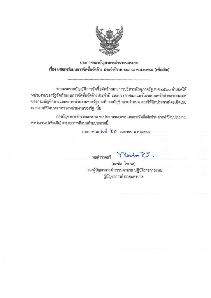 ประกาศกองบัญชาการตำรวจนครบาล เรื่อง เผยแพร่แผนการจัดซื้อจัดจ้าง ประจำปีงบประมาณ พ.ศ. 2569 (เพิ่มเติม)