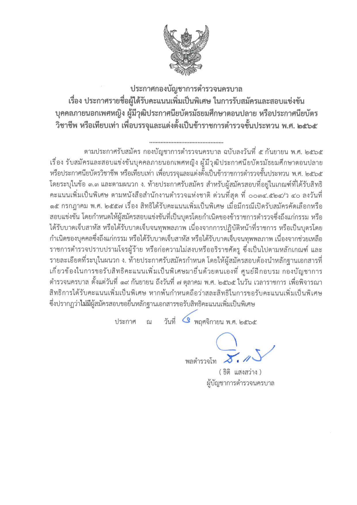 ประกาศกองบัญชาการตำรวจนครบาล เรื่อง ประกาศรายชื่อผู้ได้รับคะแนนเพิ่มเป็นพิเศษ ในการรับสมัครและสอบแข่งขันบุคคลภายนอกเพศหญิง ผู้มีวุฒิประกาศนียบัตรมัธยมศึกษาตอนปลาย หรือประกาศนียบัตรวิชาชีพ หรือเทียบเท่า เพื่อบรรจุและแต่งตั้งเป็นข้าราชการตำรวจชั้นประทวน พ.ศ.๒๕๖๕