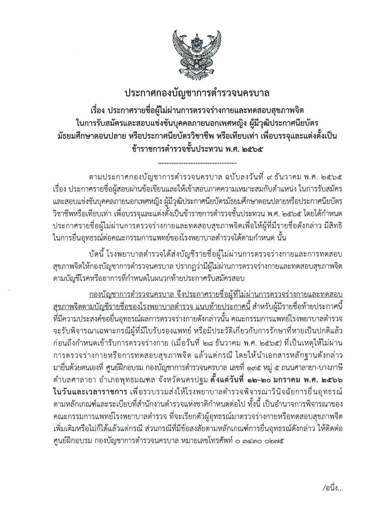 เรื่อง ประกาศรายชื่อผู้ไม่ผ่านการตรวจร่างกายและทดสอบสุขภาพจิต ในการรับสมัครและสอบแข่งขันบุคคลภายนอกเพศหญิง ผู้มีวุฒิประกาศนียบัตรมัธยาศึกษาตอนปลาย หรือประกาศนียบัตรวิชาชีพ หรือเทียบเท่า เพื่อบรรจุและแต่งตั้งเป็นข้าราชการตำรวจชั้นประทวน พ.ศ.2565