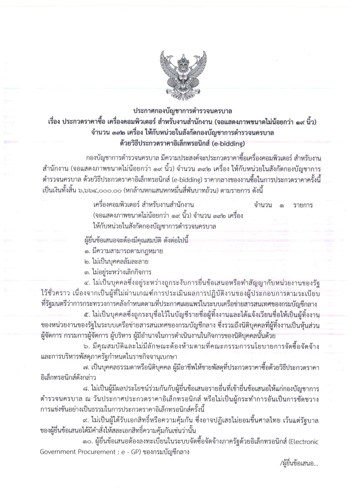 ประกาศกองบัญชาการตำรวจนครบาล เรื่องประกวดราคาซื้อ เครื่องคอมพิวเตอร์ สำหรับงานสำนักงาน (จอแสดงภาพขนาดไม่น้อยกว่า 19 นิ้ว) จำนวน 392 เครื่อง ให้กับหน่วยในสังกัดกองบัญชาการตำรวจนครบาล ด้วยวิธีประกวดราคาอิเล็กทรอนิกส์ (e-bidding)