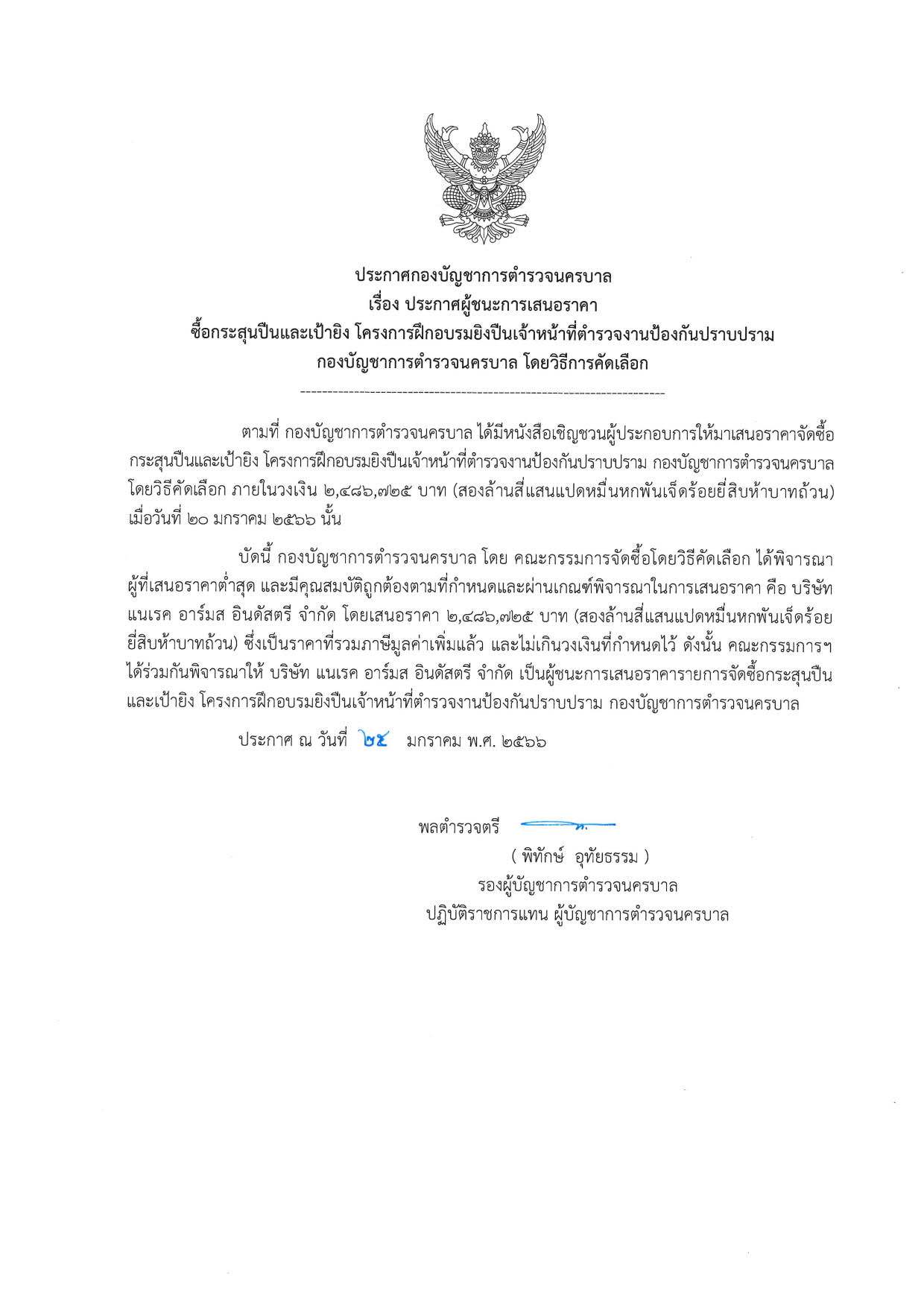 ประกาศกองบัญชาการตำรวจนครบาล เรื่อง ประกาศผู้ชนะการเสนอราคา ซื้อกระสุนปืนและเป้ายิง โครงการฝึกอบรมยิงปืนเจ้าหน้าที่ตำรวจ…