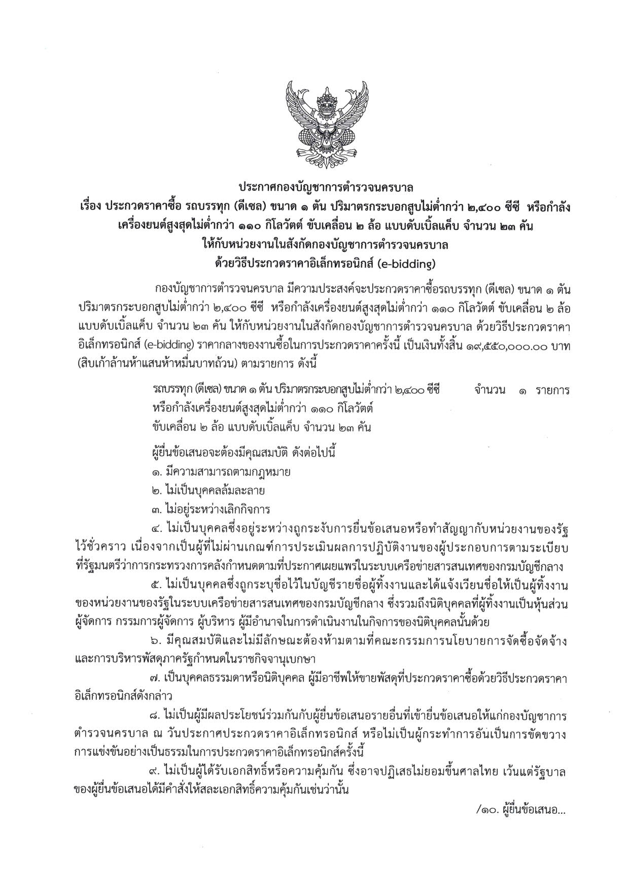 เรื่อง ประกวดราคาซื้อ รถบรรทุก (ดีเซล) ขนาด 1 ตัน ปริมาตรกระบอกสูบไม่ต่ำว่า 2,400 ซีซี หรือกำลังเครื่องยนต์สูงสุดไม่ต่ำกว่า 110 กิโลวัตต์ ขับเคลื่อน 2 ล้อ แบบดับเบิ้ลแค็บ จำนวน 23 คัน ให้กับหน่วยงานในสังกัดกองบัญชาการตำรวจนครบาล