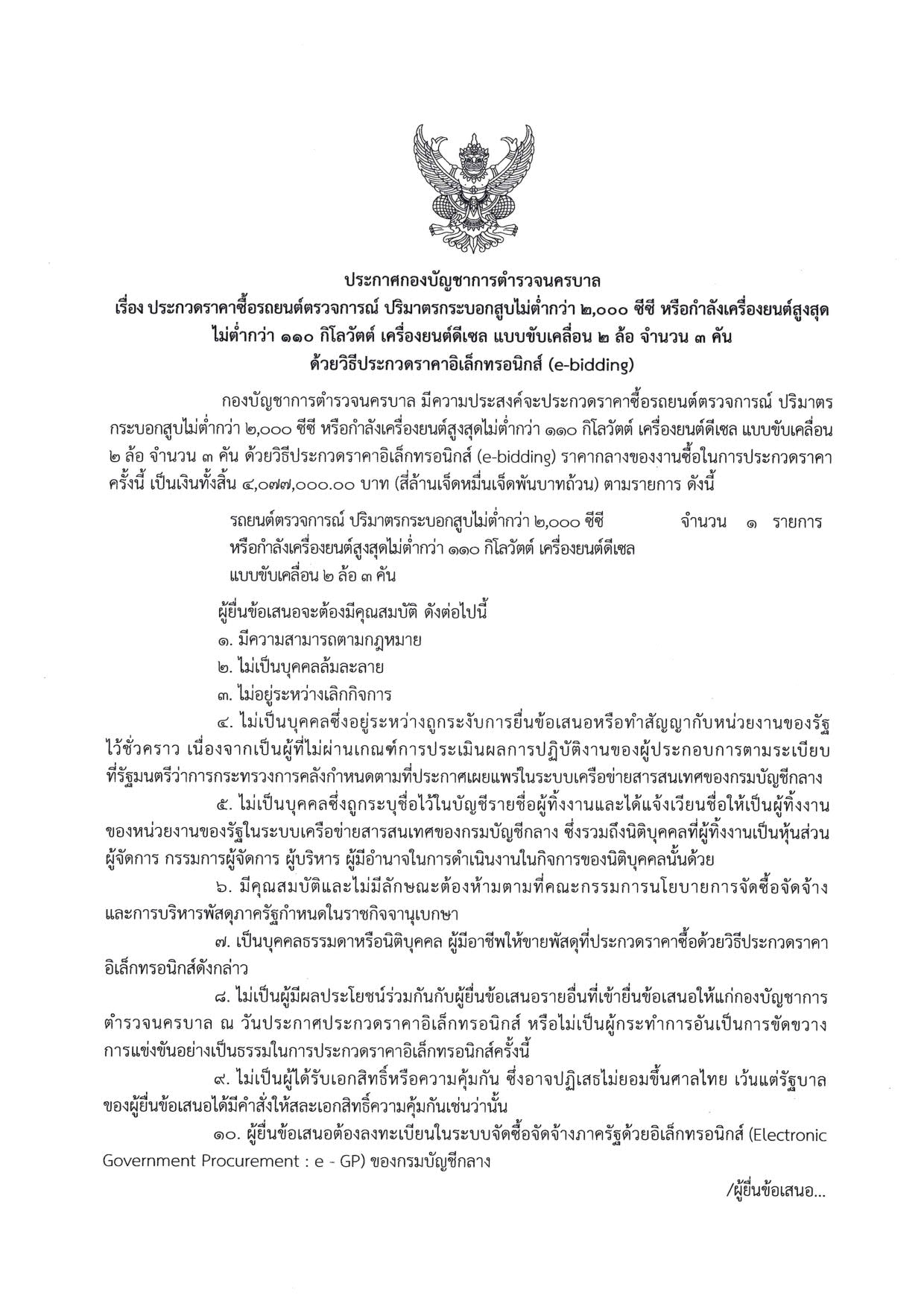 เรื่อง ประกวดราคาซื้อรถยนต์ตรวจการณ์ ปริมาตรกระบอกสูบไม่ต่ำกว่า 2,000 ซีซี หรือกำลังเครื่องยนต์สูงสุดไม่ต่ำกว่า 110 กิโลวัตต์ เครื่องยนต์ดีเซล แบบขับเคลื่อน 2 ล้อ จำนวน 3 คัน