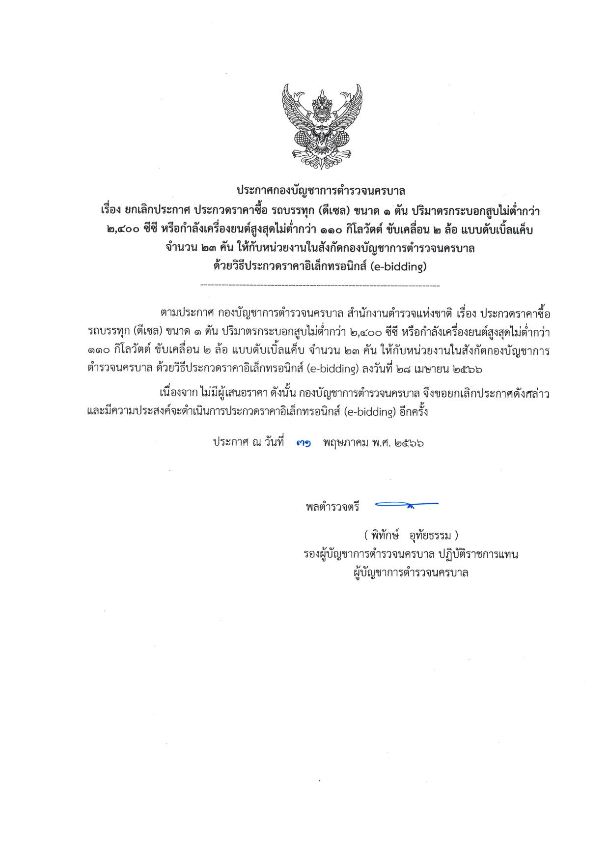 ประกาศกองบัญชาการตำรวจนครบาล เรื่อง ยกเลิกประกาศ ประกวดราคาซื้อ รถบรรทุก (ดีเซล) ขนาด 1 ตัน ปริมาตรกระบอกสูบไม่ต่ำกว่า…