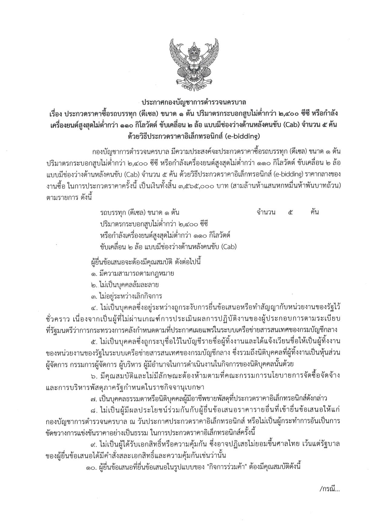ประกาศกองบัญชาการตำรวจนครบาล เรื่อง ประกวดราคาซื้อรถบรรทุก (ดีเซล) ขนาด 1 ตัน ปริมาตรกระบอกสูบไม่ต่ำกว่า 2,400 ซีซี หรือกำลังเครื่องยนต์สูงสุด…