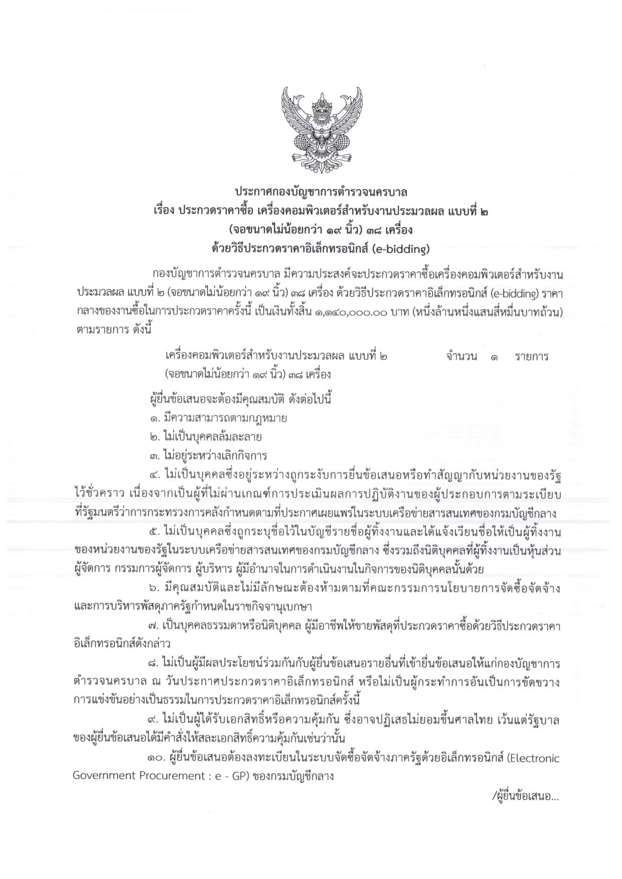 ประกาศประกวดราคา ร่างเอกสารประกวดราคา รายละเอียดคุณลักษณะ และเอกสารราคากลาง รายการจัดซื้อเครื่องคอมพิวเตอร์สำหรับงานประมวลผล แบบที่ 2 (จอแสดงภาพขนาดไม่น้อยกว่า 19 นิ้ว จำนวน 38 เครื่อง โดยวิธีการประกวดราคาอิเล็กทรอนิกส์ (e-bidding) เพื่อให้สาธารณชนวิจารณ์ ได้ตั้งแต่วันที่ 23 ธ.ค. ถึง 27 ธ.ค.65