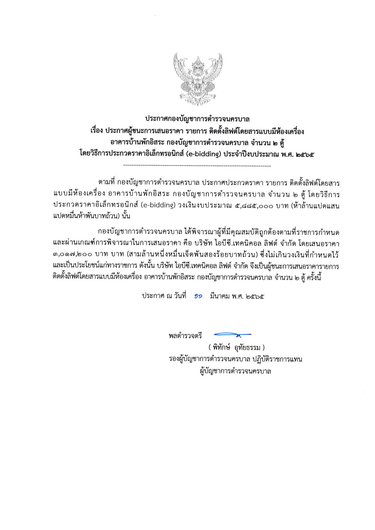 ประกาศผู้ชนะการเสนอราคา รายการติดตั้งลิฟต์โดยสารแบบมีห้องเครื่องอาคารบ้านพักอิสระ กอบบัญชาการตำรวจนครบาล จำนวน 2 ตู้ โดยวิธีการประกวดราคาอิเล็กทรอนิกส์ (e-bidding)