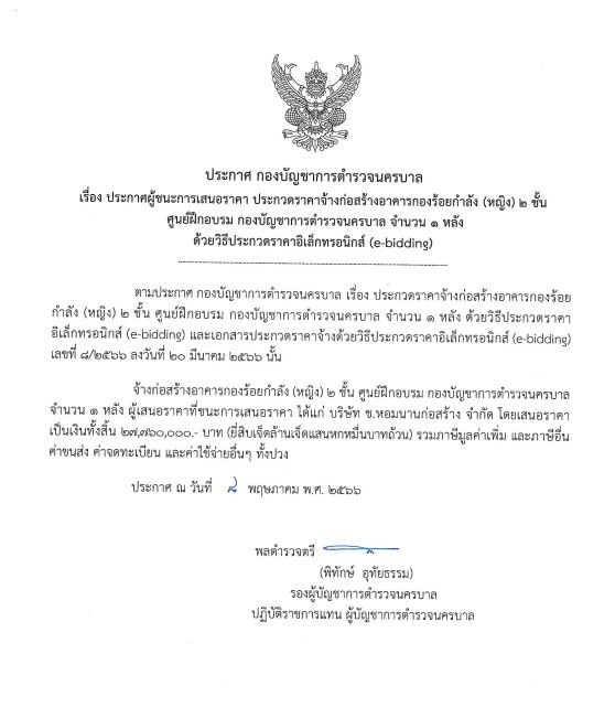 เรื่อง : ประกาศกองบัญชาการตำรวจนครบาล ลงวันที่ 8 พฤษภาคม 2566 เรื่อง ประกาศผู้ชนะการเสนอราคา ประกวดราคาจ้างก่อสร้างอาคารกองร้อยกำลัง (หญิง) 2 ชั้น ศูนย์ฝึกอบรม กองบัญชาการตำรวจนครบาล จำนวน 1 หลัง