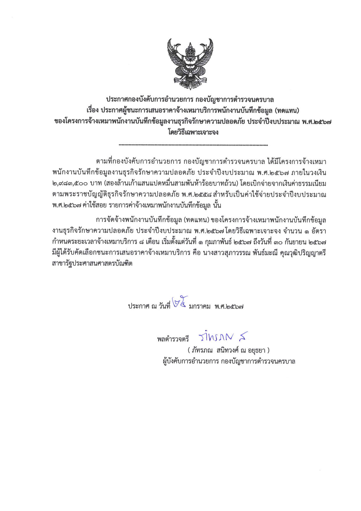 เรื่อง ประกาศผู้ชนะการเสนอราคาจ้างเหมาบริการพนักงานบันทึกข้อมูล (ทดแทน) งานธุรกิจ รปภ. จำนวน 1 อัตรา โดยวิธีเฉพาะเจาะจง