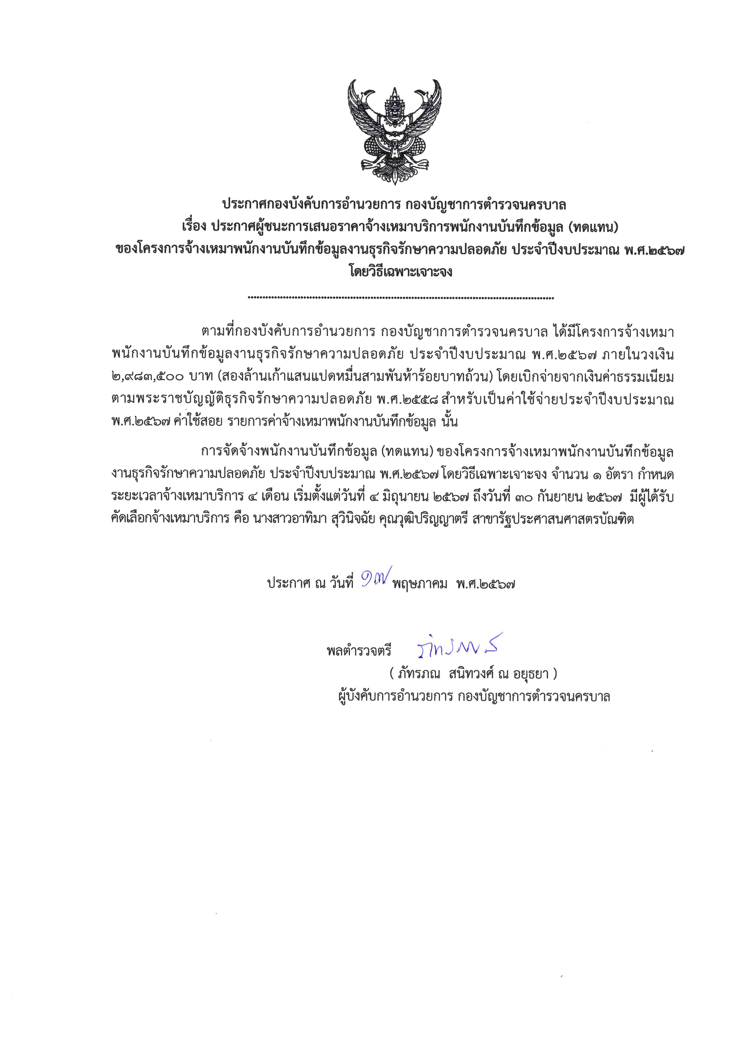 ประกาศผู้ชนะการเสนอราคาจ้างเหมาบริการพนักงานบันทึกข้อมูล (ทดแทน) งานธุรกิจ รปภ.