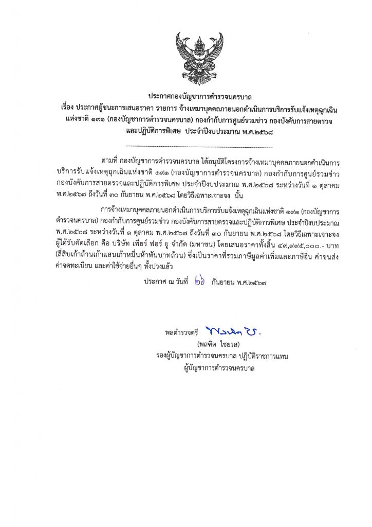 ประกาศผู้ชนะการเสนอราคา รายการ จ้างเหมาบุคคลภายนอกดำเนินการบริการรับแจ้งเหตุฉุกเฉินแห่งชาติ 191 (กองบัญชาการตำรวจนครบาล) กก.ศูนย์รวมข่าว บก.สปพ. ประจำปีงบประมาณ พ.ศ.2568