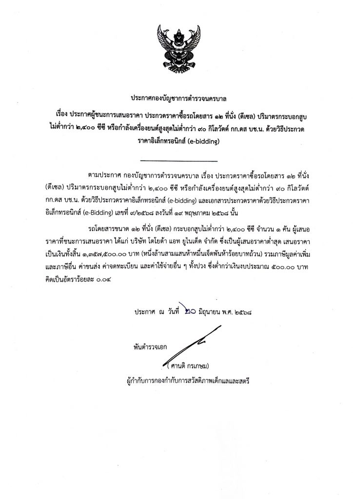 ประกาศผู้ชนะการเสนอราคา ประกวดราคาซื้อรถโดยสาร 12 ที่นั่ง (ดีเซล) ปริมาตรกระบอกสูบไม่ต่ำกว่า 2,400 ซีซี หรือกำลังเครื่องยนต์สูงสุดไม่ต่ำกว่า 90 กิโลวัตต์ กก.ดส บช.น. ด้วยวิธีประกวดราคาอิเล็กทรอนิกส์ (e-bidding)