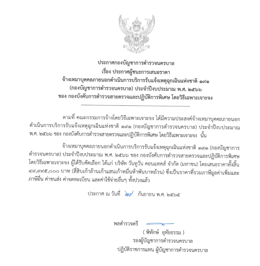 ประกาศผู้ชนะ จ้างเหมาบุคคลภายนอกดำเนินการบริการรับแจ้งเหตุฉุกเฉินแห่งชาติ 191 (บช.น.)