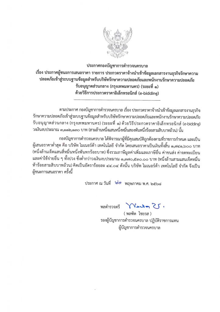 ประกาศผู้ชนะ รายการประกวดราคาจ้างนำเข้าข้อมูลเอกสารงานธุรกิจรักษาความปลอดภัยเข้าสู่ระบบฐานข้อมูลสำหรับบริษัทรักษาความปลอดภัยและพนักงานรักษาความปลอดภัยรับอนุญาตส่วนกลาง (กรุงเทพมหานคร) (ระยะที่ 1) ด้วยวิธีประกวดราคาอิเล็กทรอนิกส์ (e-bidding) วงเงิน 3,112,130.00 บาท