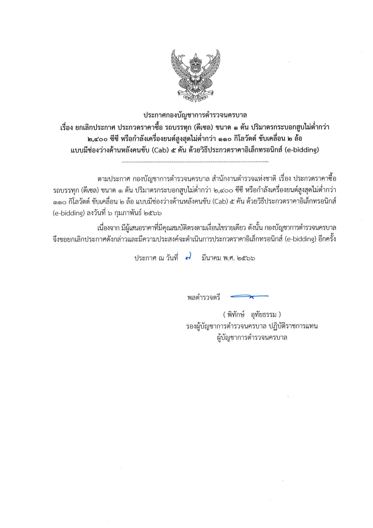 ประกาศยกเลิกประกาศประกวดราคาซื้อ รถบรรทุก (ดีเซล) ขนาด 1 ตัน ปริมาตรกระบอกสูบไม่ต่ำกว่า 2,400 ซีซี หรือกำลังเครื่องยนต์สูงสุดไม่ต่ำกว่า 110 กิโลวัตต์ ขับเคลื่อน 2 ล้อ แบบมีช่องว่างด้านหลังคนขับ (Cab) 5 คัน ด้วยวิธีการประกวดราคาอิเล็กทรอนิกส์ (e-bidding)
