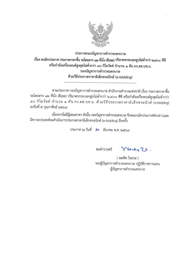 ประกาศยกเลิกประกาศประกวดราคาซื้อรถโดยสาร ๑๒ ที่นั่ง (ดีเซล) ปริมาตรกระบอกสูบไม่ต่ำกว่า ๒,๔๐๐ ซีซี หรือกำลังเครื่องยนต์สูงสุดไม่ต่ำกว่า ๙๐ กิโลวัตต์ กก.ดส.บช.น. จำนวน 1 คัน ด้วยวิธีประกวดราคาอิเล็กทรอนิกส์