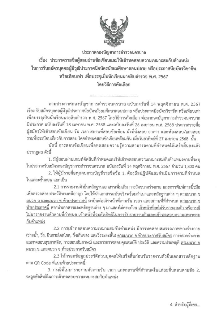 ประกาศรายชื่อผู้สอบผ่านข้อเขียนและให้เข้าทดสอบความเหมาะสมกับตำแหน่ง ในการรับสมัครบุคคลผู้มีวุฒิประกาศนียบัตรมัธยมศึกษาตอนปลาย หรือประกาศนียบัตรวิชาชีพ หรือเทียบเท่า เพื่อบรรจุเป็นนักเรียนนายสิบตำรวจ พ.ศ. 2567 โดยวิธีการคัดเลือก
