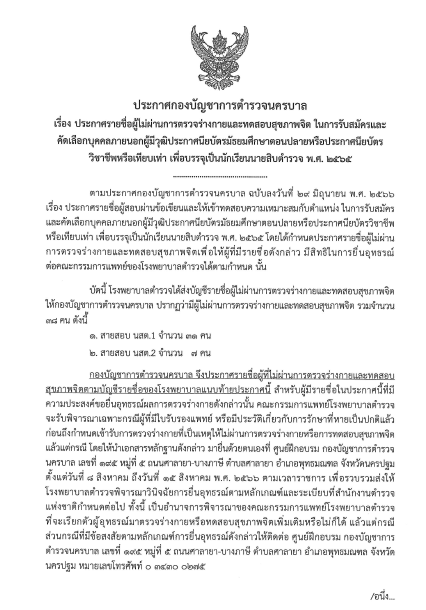 ประกาศรายชื่อผู้ไม่ผ่านการตรวจร่างกายและทดสอบสุขภาพจิต ในการรับสมัครและคัดเลือกบุคคลภายนอกผู้มีวุฒิประกาศนียบัตรมัธยมศึกษาตอนปลาย หรือประกาศนียบัตรวิชาชีพ