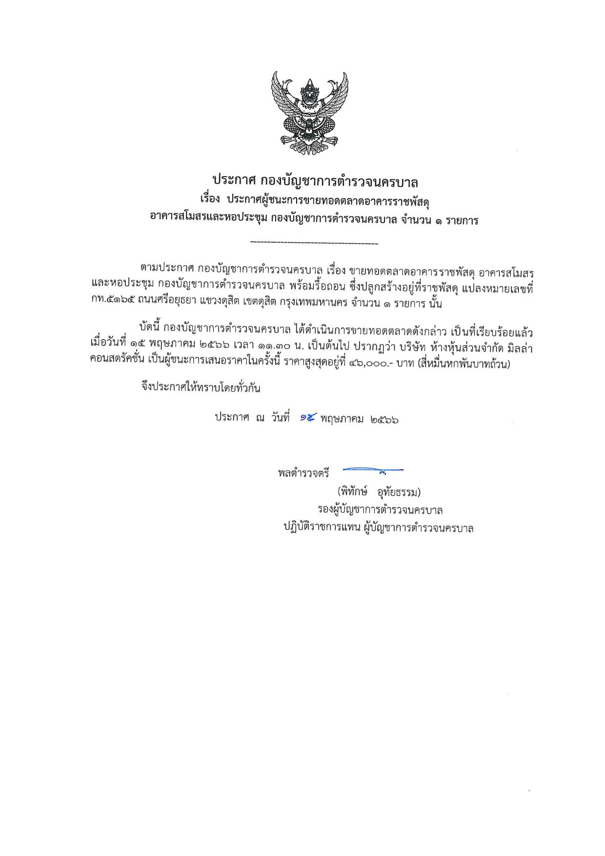 ประกาศ กองบัญชาการตำรวจนครบาล เรื่อง ประกาศผู้ชนะการขายทอดตลาดอาคารราชพัสดุ…
