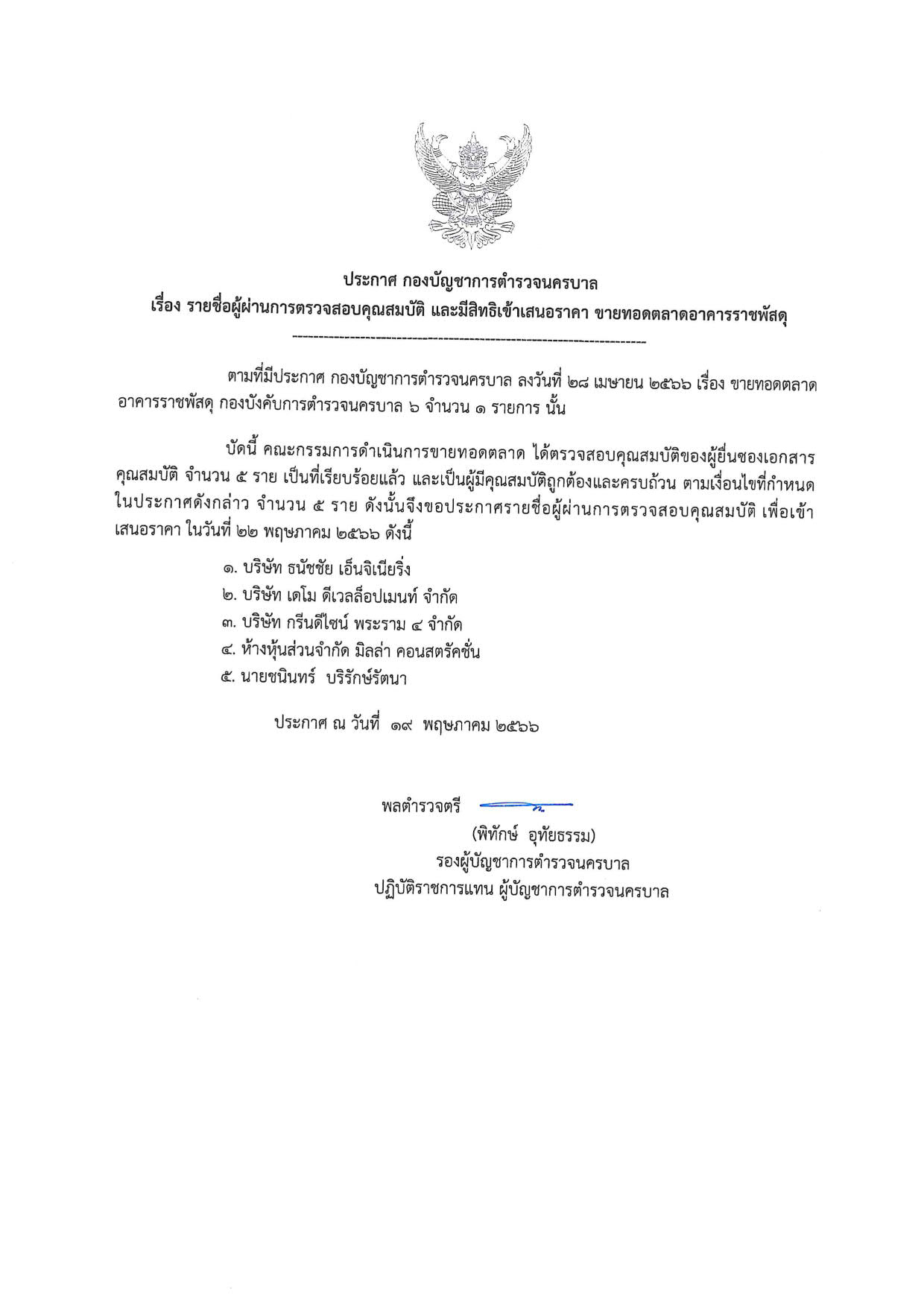 ประกาศ กองบัญชาการตำรวจนครบาล เรื่อง รายชื่อผู้ผ่านการตรวจสอบคุณสมบัติ และมีสิทธิเข้าเสนอราคา ขายทอดตลาดอาคารราชพัสดุ กองบังคับการตำรวจนครบาล 6 จำนวน 1 รายการ