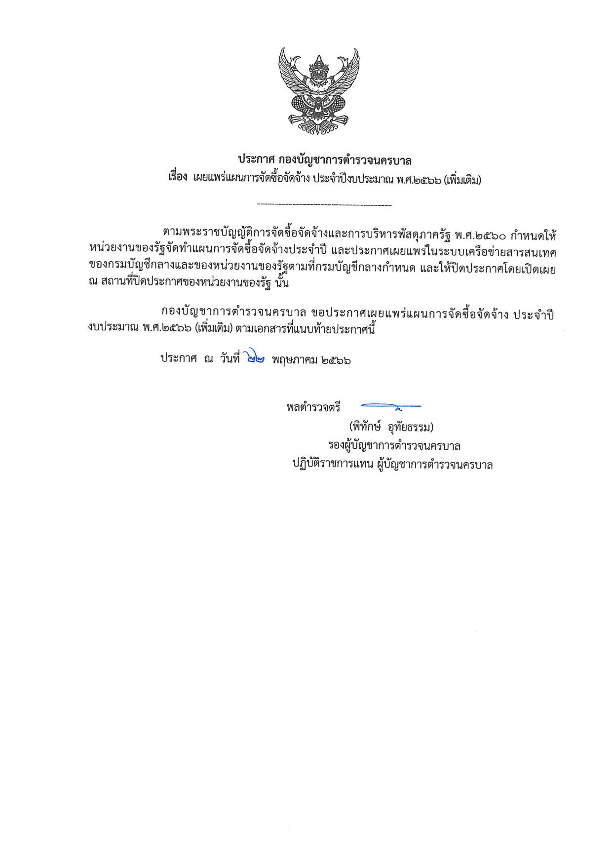 ประกาศ กองบัญชาการตำรวจนครบาล เรื่อง เผยแพร่แผนการจัดซื้อจัดจ้าง ประจำปีงบประมาณ พ.ศ.2566 (เพิ่มเติม)
