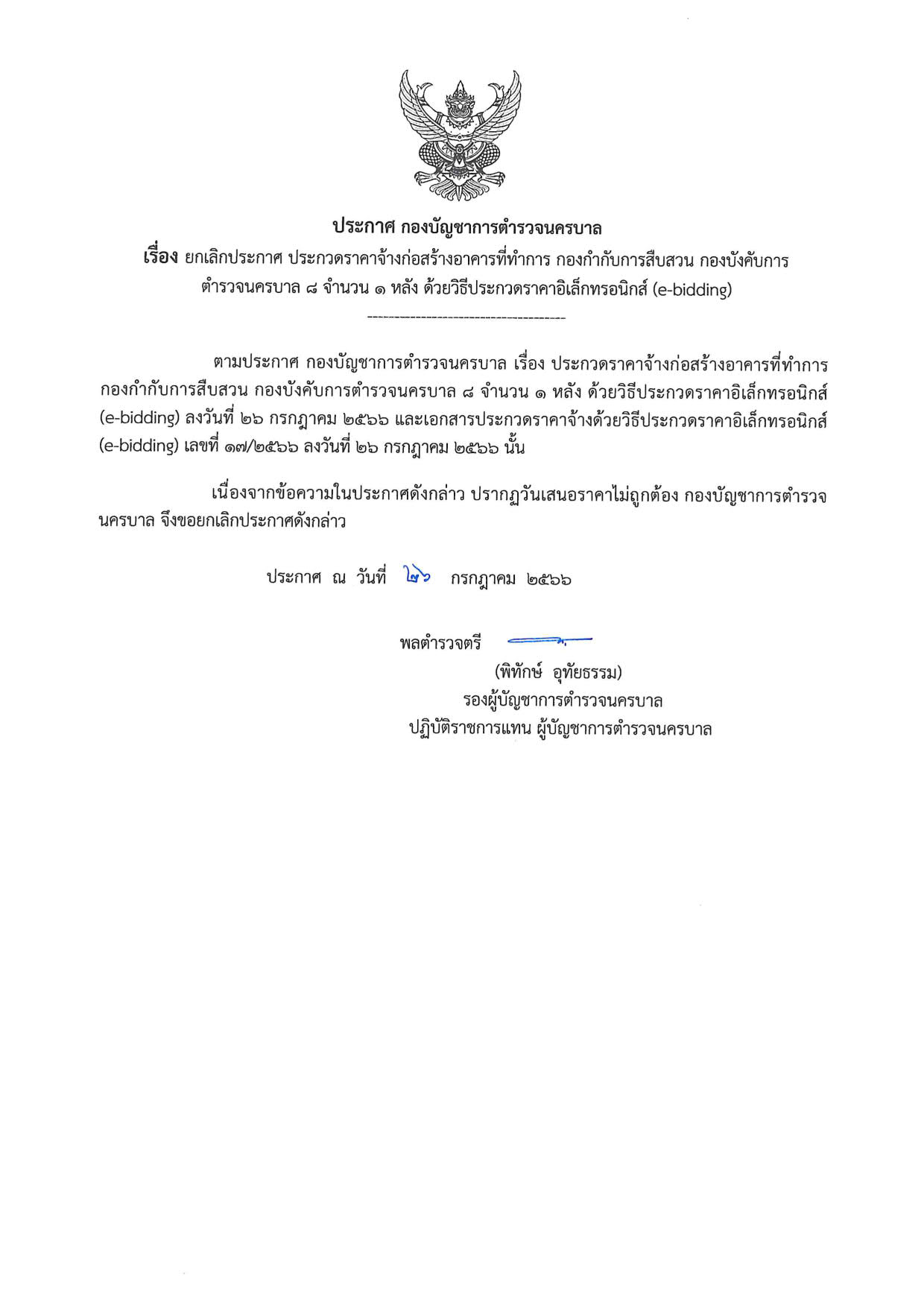 ประกาศ กองบัญชาการตำรวจนครบาล เรื่อง ยกเลิกประกาศประกวดราคาจ้างก่อสร้างอาคารที่ทำการ กก.สส.บก.น.8 จำนวน 1 หลัง ด้วยวิธีประกวดราคาอิเล็กทรอนิกส์ (e-bidding)