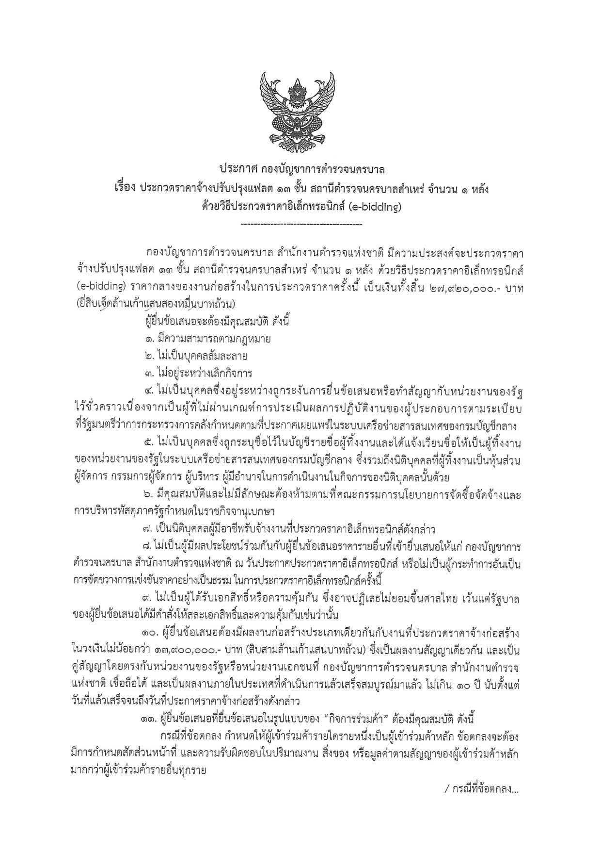 ประกาศ กองบัญชาการตำรวจนครบาล เรื่อง ประกวดราคาจ้างปรับปรุงแฟลต 13 ชั้น สน.สำเหร่ จำนวน 1 หลัง ด้วยวิธีประกวดราคาอิเล็กทรอนิกส์ (e-bidding)