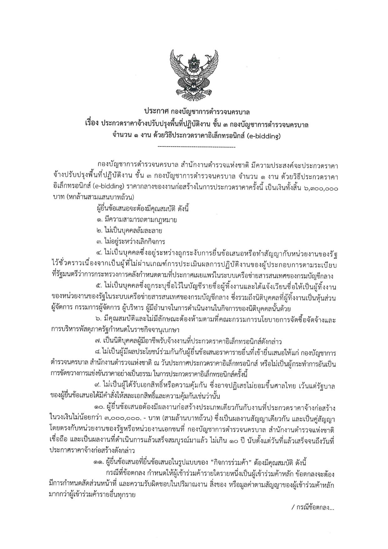 ประกาศ กองบัญชาการตำรวจนครบาล เรื่อง ร่างประกาศประกวดราคาจ้างปรับปรุงพื้นที่ปฏิบัติงาน ชั้น 3 บช.น.