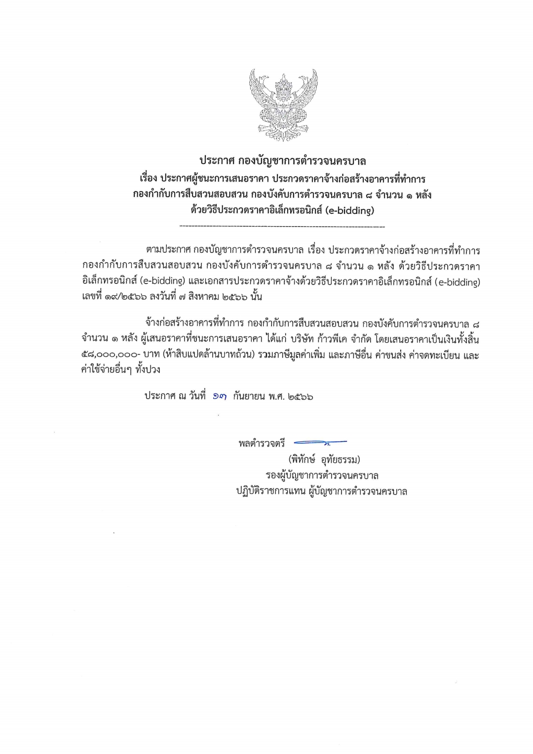 ประกาศ กองบัญชาการตำรวจนครบาล เรื่อง ประกาศผู้ชนะการเสนอราคา ประกวดราคาจ้างก่อสร้างอาคารที่ทำการ กก.สส.บก.น.8 จำนวน 1 หลัง ด้วยวิธีประกวดราคาอิเล็กทรอนิกส์ (e-bidding)
