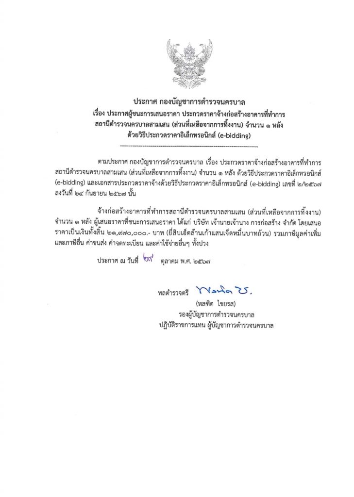 ประกาศกองบัญชาการตำรวจนครบาล เรื่อง ประกวดราคาจ้างก่อสร้างจ้างเหมาก่อสร้างอาคารที่ทำการ 4 ชั้น มีดาดฟ้า สน.สามเสน จำนวน 1 หลัง