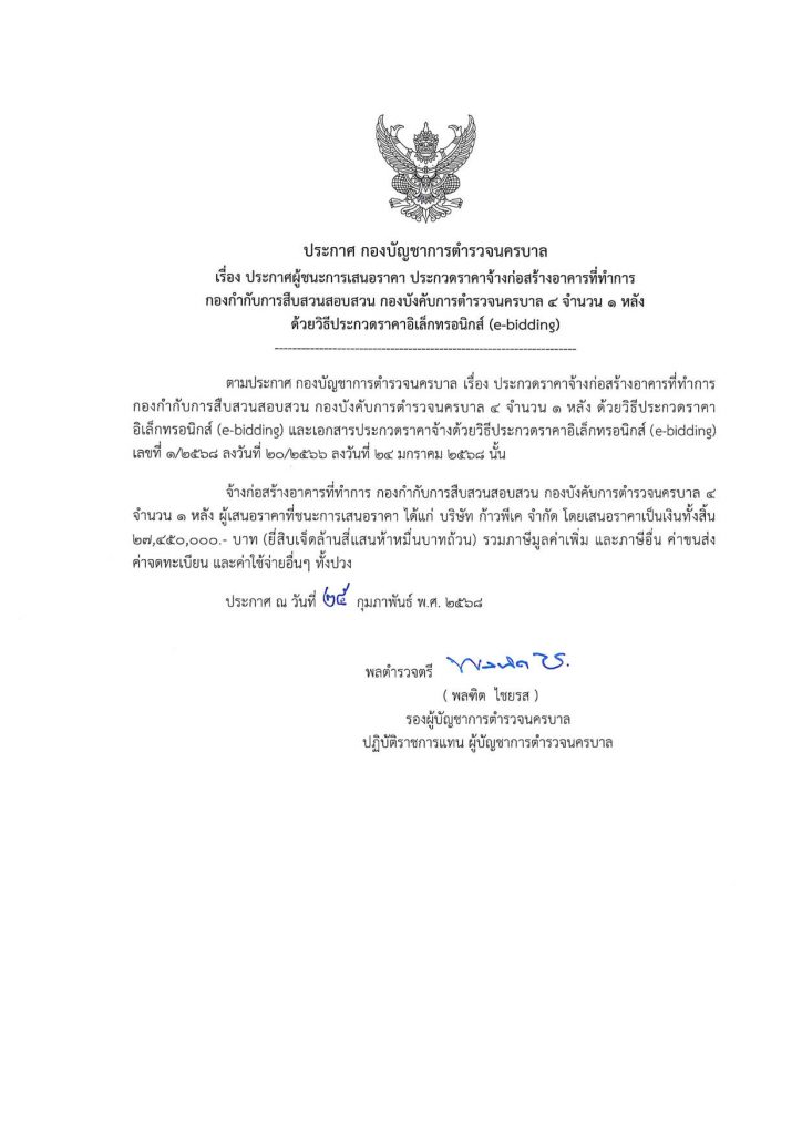 ประกาศ กองบัญชาการตำรวจนครบาล เรื่อง ประกาศผู้ชนะการเสนอราคา ประกวดราคาจ้างก่อสร้างอาคารที่ทำการ กก.สส.บก.น.4 จำนวน 1 หลัง ด้วยวิธีประกวดราคาอิเล็กทรอนิกส์ (e-bidding)
