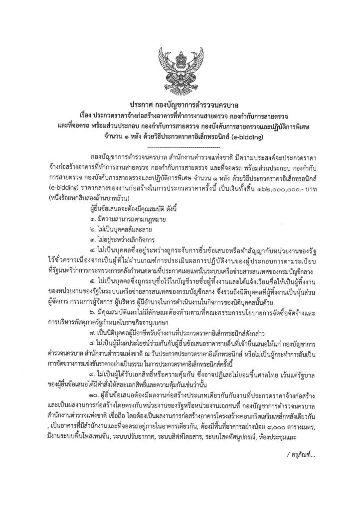 ประกาศ กองบัญชาการตำรวจนครบาลเรื่อง ประกวดราคาจ้างก่อสร้างอาคารที่ทำการงานสายตรวจ กก.สายตรวจ ที่จอดรถ พร้อมส่วนประกอบ กก.สายตรวจ บก.สปพ.จำนวน ๑ หลัง ด้วยวิธีประกวดราคาอิเล็กทรอนิกส์ (e-bidding)