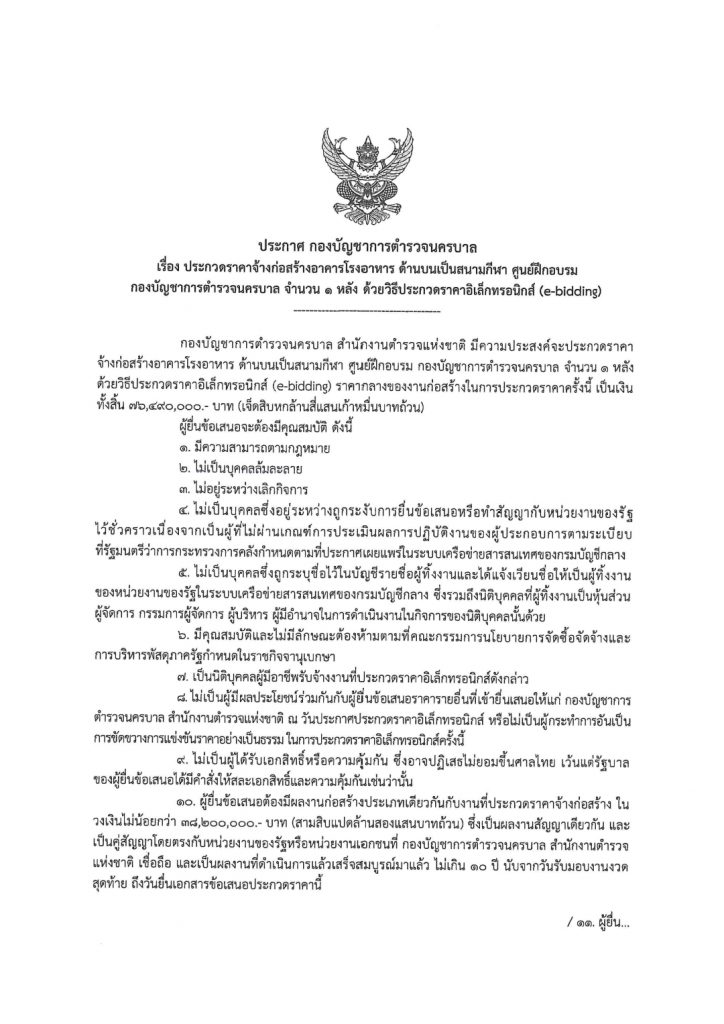 ประกาศ กองบัญชาการตำรวจนครบาล เรื่อง ร่างประกาศประกวดราคาจ้างก่อสร้างอาคารกองบังคับการ 4 ชั้น ศูนย์ฝึกอบรม กองบัญชาการตำรวจนครบาล จำนวน 1 หลัง ด้วยวิธีประกวดราคาอิเล็กทรอนิกส์ (e-bidding)