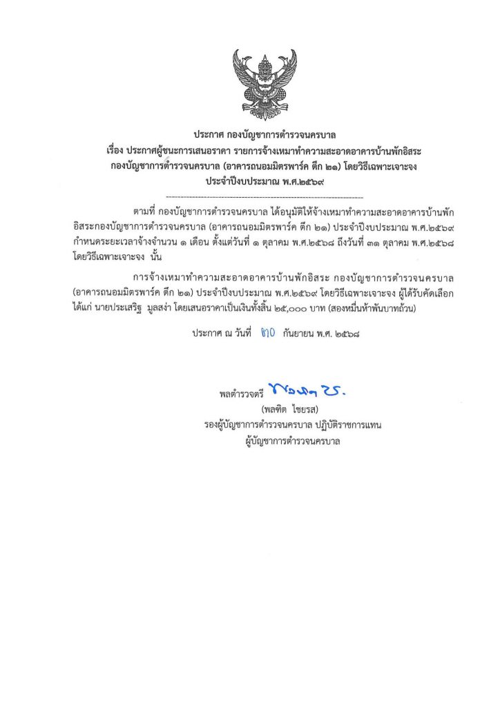 เรื่อง ประกาศผู้ชนะการเสนอราคา รายการ จ้างเหมาบำรุงรักษาโปรแกรมบริหารจัดการระบบฐานข้อมูลสำหรับบริษัทรักษาความปลอดภัยและพนักงานรักษาความปลอดภัยรับอนุญาตส่วนกลาง (กรุงเทพมหานคร) ศูนย์บริการธุรกิจรักษาความปลอดภัย กองบังคับการอำนวยการ