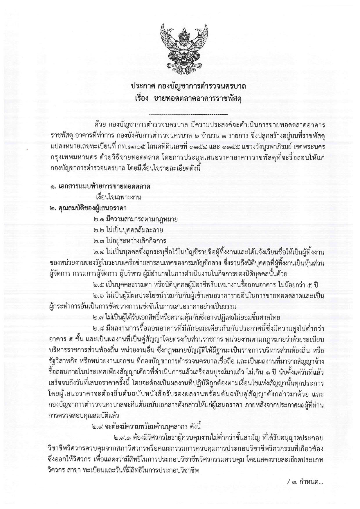 ประกาศ กองบัญชาการตำรวจนครบาล เรื่อง ขายทอดตลาดอาคารราชพัสดุ (อาคารที่ทำการ บก.น.6)
