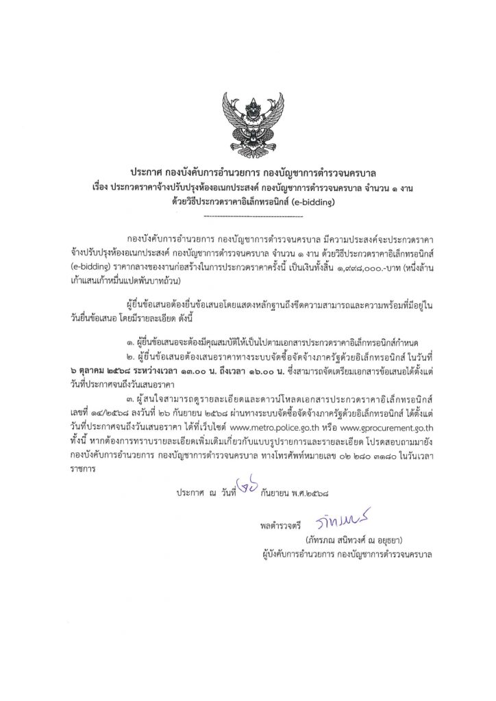 ประกาศ บก.อก.บช.น. เรื่อง ประกวดราคาจ้างปรับปรุงห้องอเนกประสงค์ บช.น. จำนวน 1 งาน ด้วยวิธีประกวดราคาอิเล็หทรอนิกส์ (e-bidding)