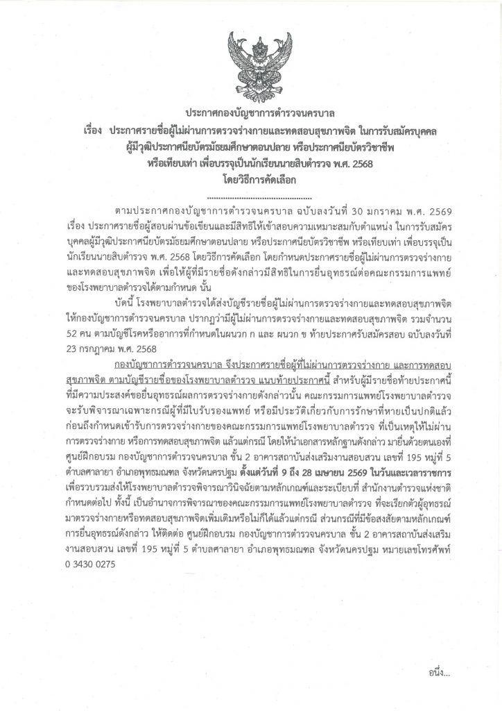ประกาศ บช.น. เรื่อง ประกาศรายชื่อผู้ไม่ผ่านการตรวจร่างกายและทดสอบสุขภาพจิต ในการรับสมัครบุคคลผู้มีวุฒิประกาศนียบัตรมัธยมศึกษาตอนปลาย หรือประกาศนียบัตรวิชาชีพ หรือเทียบเท่า เพื่อบรรจุเป็นนักเรียนนายสิบตำรวจ พ.ศ. 2568 โดยวิธีการคัดเลือก