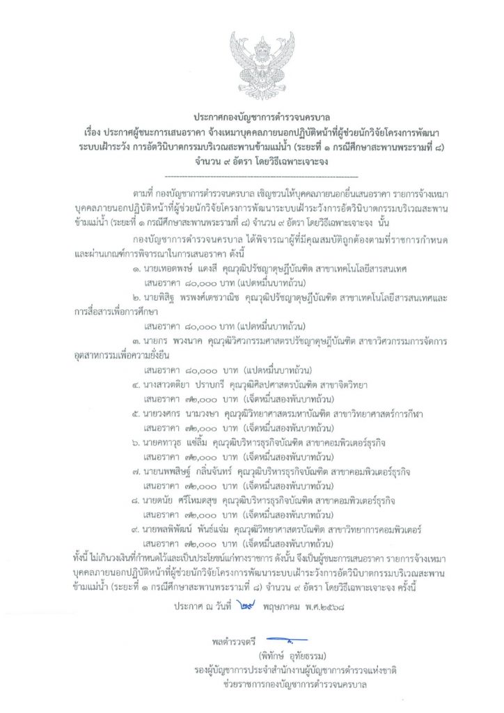 ประกาศผู้ชนะการเสนอราคาจ้างเหมาบุคคลภายนอกปฏิบัติหน้าที่ผู้ช่วยนักวิจัยโครงการพัฒนาระบบเฝ้าระวังการอัตวินิบาตกรรมบริเวณสะพานข้ามแม่น้ำ (ระยะที่ 1 กรณีศึกษาสะพานพระรามที่ 8) จำนวน 9 อัตรา โดยวิธีเฉพาะเจาะจง