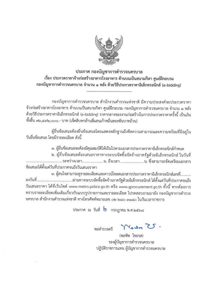 ประกาศกองบังคับการอำนวยการ กองบัญชาการตำรวจนครบาลเรื่อง ประกาศผู้ชนะการเสนอราคา รายการจ้างเหมาทำความสะอาดอาคารบ้านพักอิสระกองบังคับการอำนวยการ กองบัญชาการตำรวจนครบาล (อาคารตลิ่งชัน) โดยวิธีเฉพาะเจาะจงประจำปีงบประมาณ พ.ศ.2568