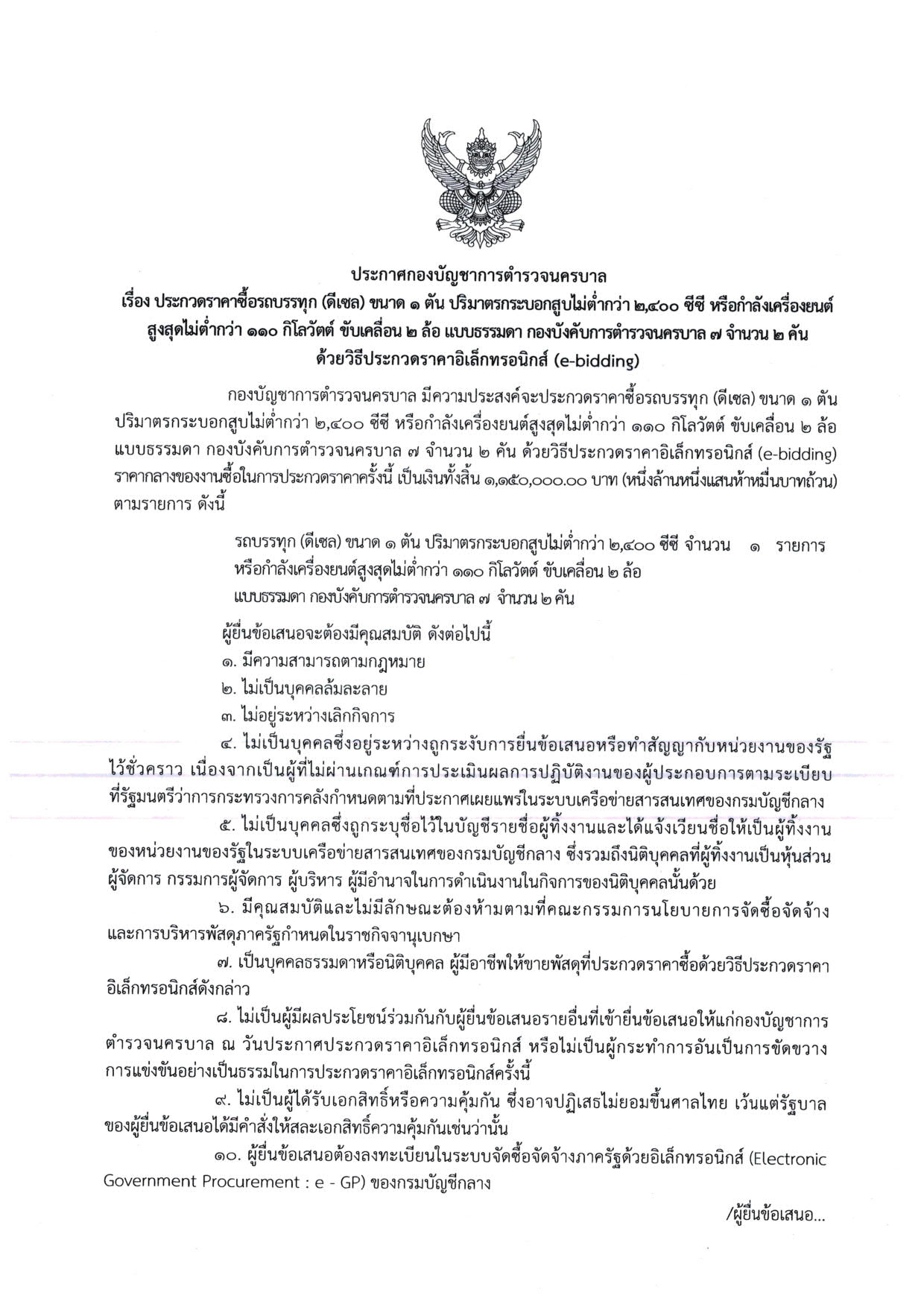 เผยแพร่ประกาศประกวดราคา เอกสารประกวดราคา ขอบเขตของงาน และเอกสารราคากลาง รายการจัดซื้อรถบรรทุก (ดีเซล) ขนาด 1 ตัน ปริมาตรกระบอกสูบไม่ต่ำกว่า 2,400 ซีซี หรือกำลังเครื่องยนต์สูงสุดไม่ต่ำกว่า 110 กิโลวัตต์ ขับเคลื่อน 2 ล้อ แบบธรรมดา บก.น.7 จำนวน 2 คัน โดยวิธีการประกวดราคาอิเล็กทรอนิกส์ (e-bidding)