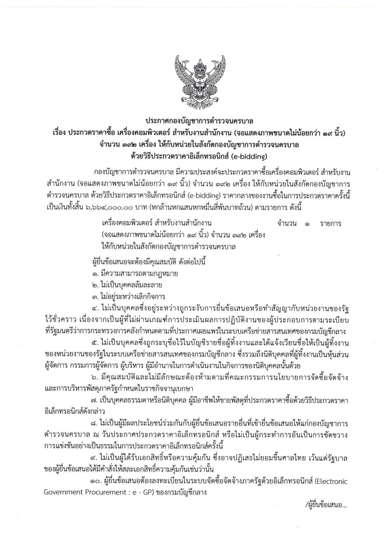 เผยแพร่ประกาศประกวดราคา เอกสารประกวดราคา ขอบเขตของงาน Terms of Reference : TOR และเอกสารราคากลาง รายการจัดซื้อเครื่องคอมพิวเตอร์ สำหรับงานสำนักงาน (จอแสดงภาพขนาดไม่น้อยกว่า 19 นิ้ว) จำนวน 392 เครื่อง ให้กับหน่วยในสังกัดกองบัญชาการตำรวจนครบาล