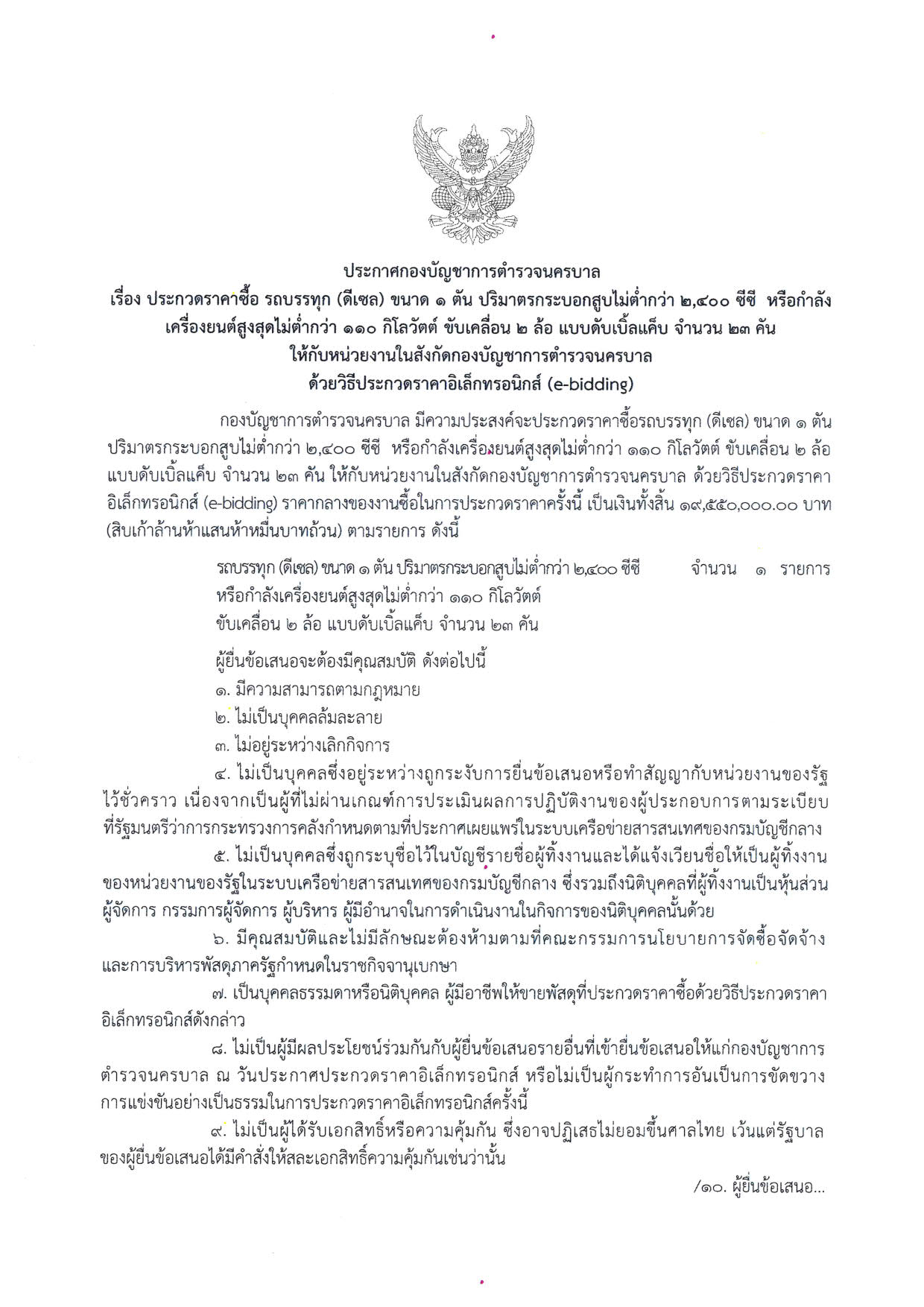 เผยแพร่ร่างประกาศประกวดราคา ร่างเอกสารประกวดราคา และขอบเขตของงาน Terms of Reference : TOR รายการจัดซื้อรถบรรทุก (ดีเซล) ขนาด 1 ตัน ปริมาตรกระบอกสูบไม่ต่ำกว่า 2,400 ซีซี หรือกำลังเครื่องยนต์สูงสุดไม่ต่ำกว่า 110 กิโลวัตต์ ขับเคลื่อน 2 ล้อ แบบดับเบิ้ลแค็บ จำนวน 23 คัน ให้กับหน่วยงานในสังกัดกองบัญชาการตำรวจนครบาล โดยวิธีการประกวดราคาอิเล็กทรอนิกส์ (e-bidding) เพื่อให้สาธารณชนวิจารณ์ ได้ตั้งแต่วันที่ 12 – 24 เม.ย.66