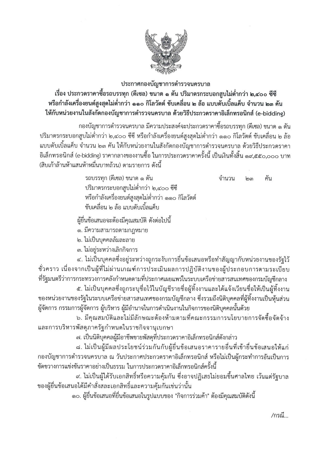 ประกาศประกวดราคา ร่างเอกสารประกวดราคา ขอบเขตของงาน รายละเอียดคุณลักษณะเฉพาะ และราคากลาง รายการจัดซื้อรถบรรทุก (ดีเซล) ขนาด 1 ตัน ปริมาตรกระบอกสูบไม่ต่ำกว่า 2,400 ซีซี หรือกำลังเครื่องยนต์สูงสุดไม่ต่ำกว่า 110 กิโลวัตต์ ขับเคลื่อน 2 ล้อ แบบดับเบิ้ลแค็บ จำนวน 23 คัน ให้กับหน่วยงานในสังกัดกองบัญชาการตำรวจนครบาล โดยวิธีการประกวดราคาอิเล็กทรอนิกส์ (e-bidding)