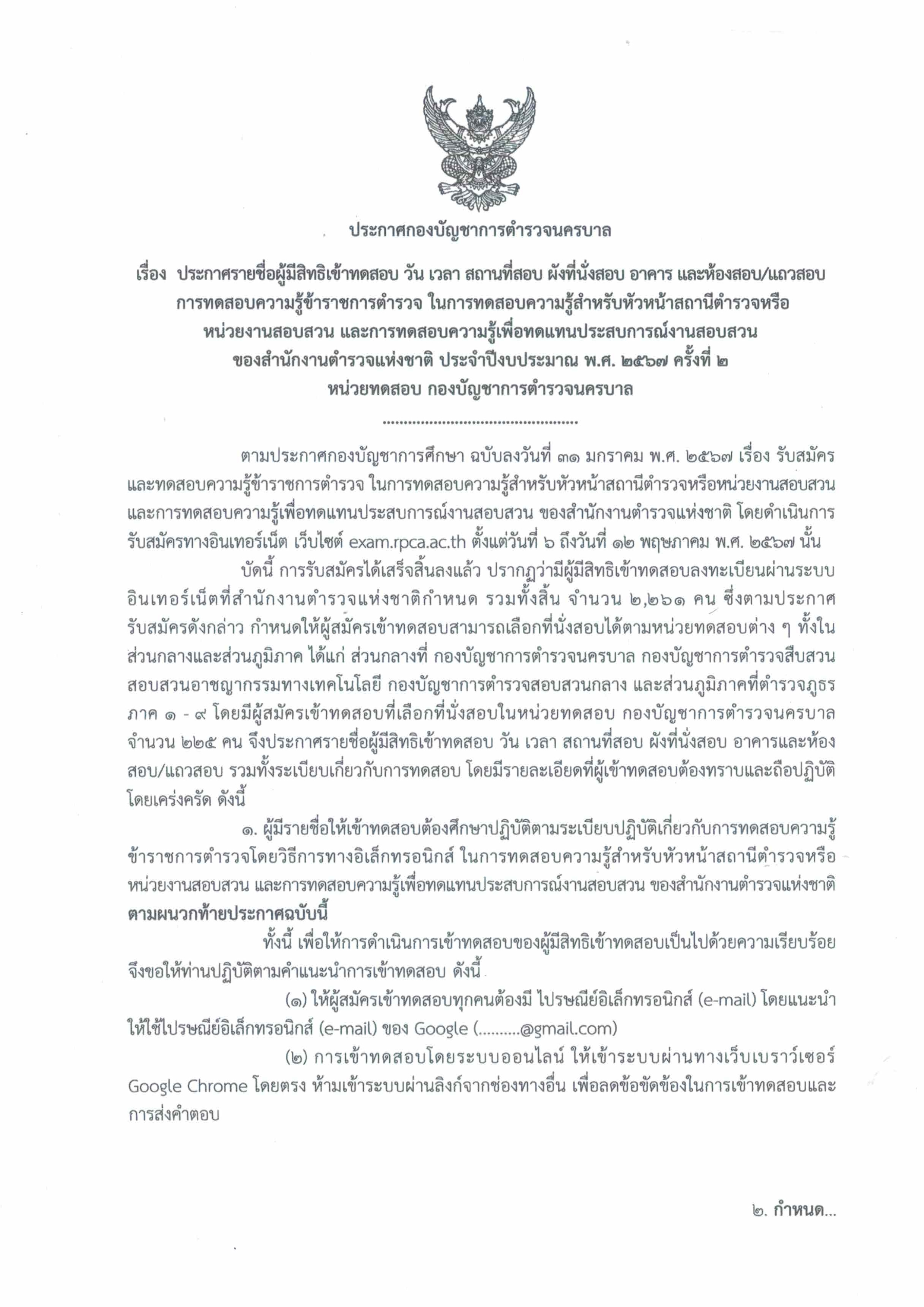 ประกาศรายชื่อผู้มีสิทธิเข้าทดสอบ วัน เวลา สถานที่สอบ ผังที่นั่งสอบอาคาร และห้องสอบ/แถวสอบการทดสอบความรู้ข้าราชการตำรวจ ในการทดสอบความรู้สำหรับหัวหน้าสถานีตำรวจหรือ